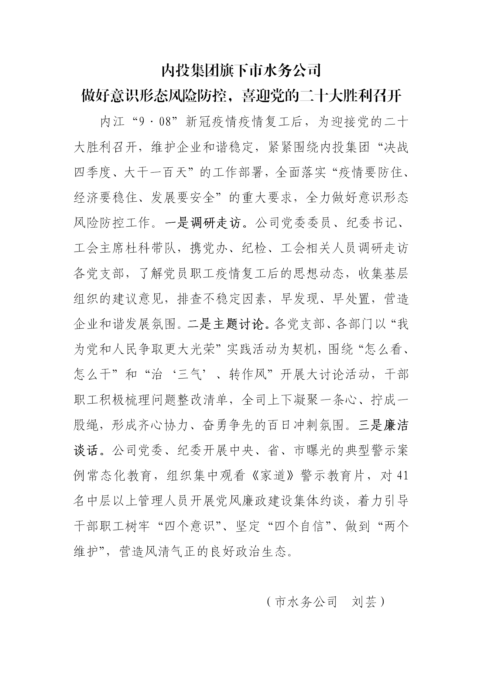 內(nèi)投集團(tuán)旗下市水務(wù)公司 做好意識(shí)形態(tài)風(fēng)險(xiǎn)防控,喜迎黨的二十大勝利召開